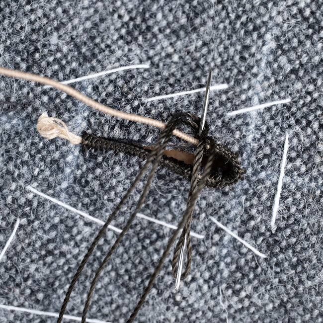 This is a gimp used to give structure and dimension to hand-sewn buttonholes and milanese on the lapel.