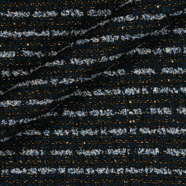 Elegant and modern black/ blue / gold and special denim yarns tweed, made from a blend of exclusive fibres that make it perfect for special occasions where sophistication is essential.