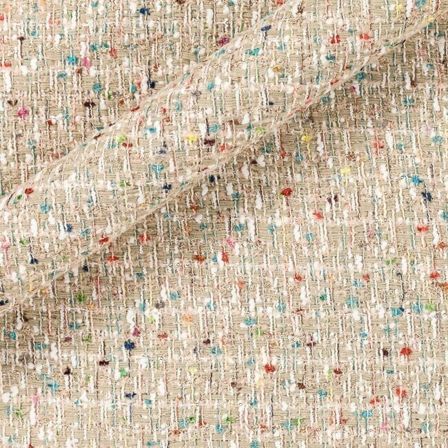 Soft beige tweed with pastel threads (sky blue, pink, green) and some metallic fibres.