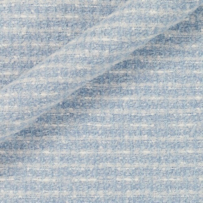 Sky blue tweed with white threads forming an irregular grid. Fresh appearance.