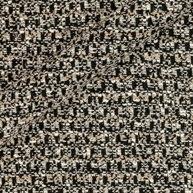 Contrasting black and white tweed with a graphic weave and discreet metallic reflections.